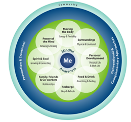 First, The Circle of Health - Whole Health (va.gov) includes Self-care promoting mindful awareness, moving the body, surroundings, personal development, food and drink, recharge, family, friends & coworkers, spirit & soul, and power of the mind. Professional care includes preventative and conventional care including medications and clinical care as well as complementary medical care such as acupuncture, meditation, yoga and more. Community focuses on building connections in the community through involvement. Overall, the goal of whole health is to treat the whole body and mind, not just physical medical issues, as you cultivate mindful awareness.